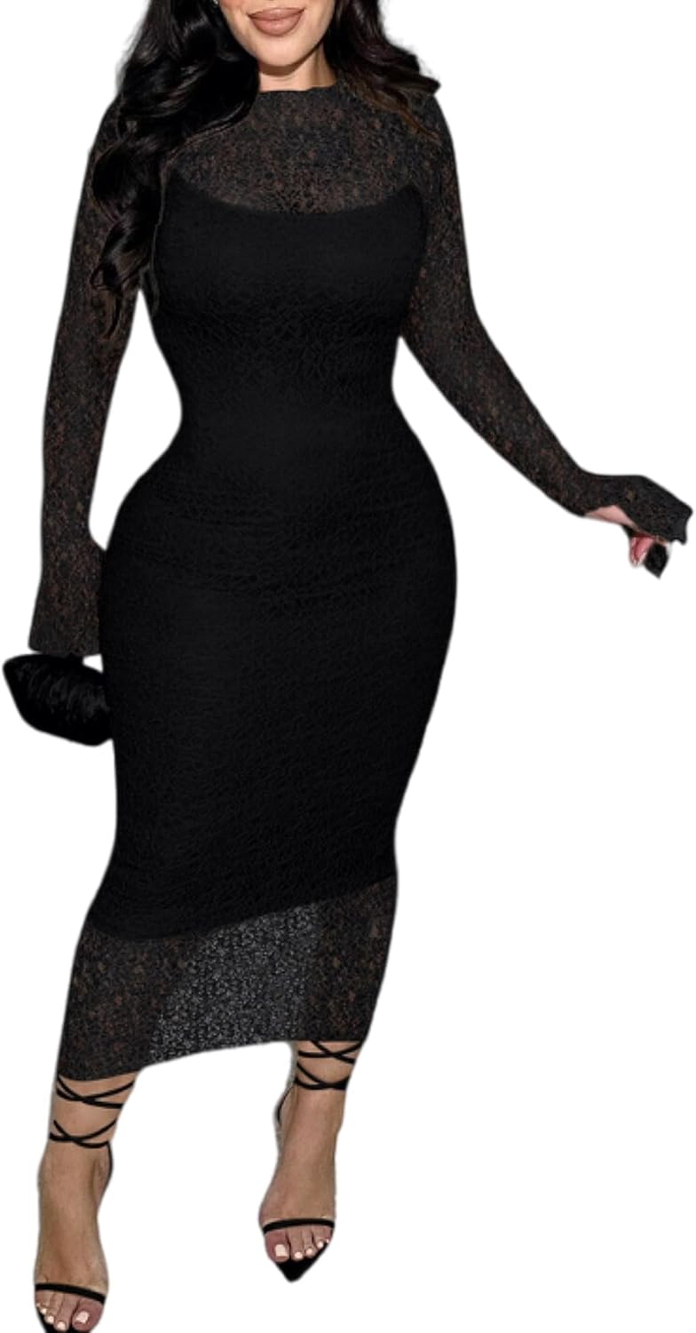 Doweha Womens Sexy Bodycon Lace Dress Elegant Long Sleeve Midi 2 Piece Dress Sets Cocktail Party Birthday Date Night Outfit