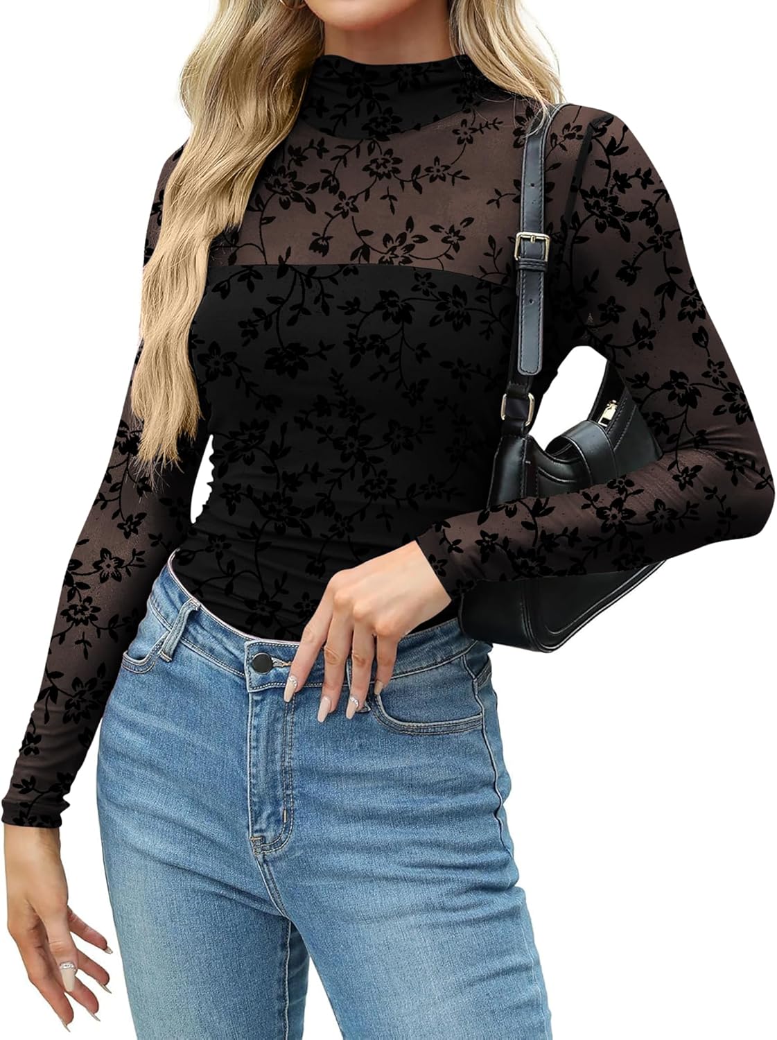 Long Sleeve Tops for Women Floral Mesh Sheer Shirts mesh shirt women sheer tops womens mock neck tops long sleeve turtleneck women going out topmesh shirt women sheer tops womens mock neck tops long sleeve turtleneck women going out top