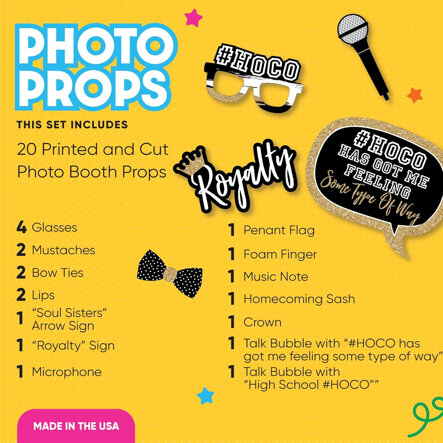 20 HOCO Dance Photo Booth PropsProfessionally Printed & CutMade of Sturdy Card Stock PaperIncludes 20 Prop Kit Sticks & AdhesivesMade in the USA