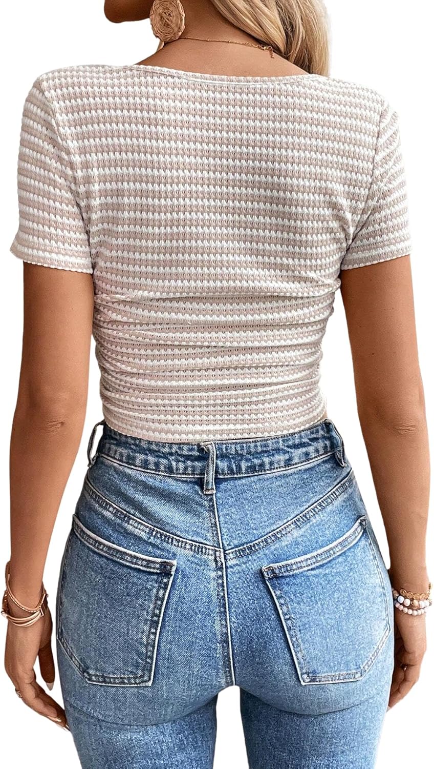 Women Summer Shirts Ruched Square Neck Blouses Going Out Knit T Shirt Basic Tees