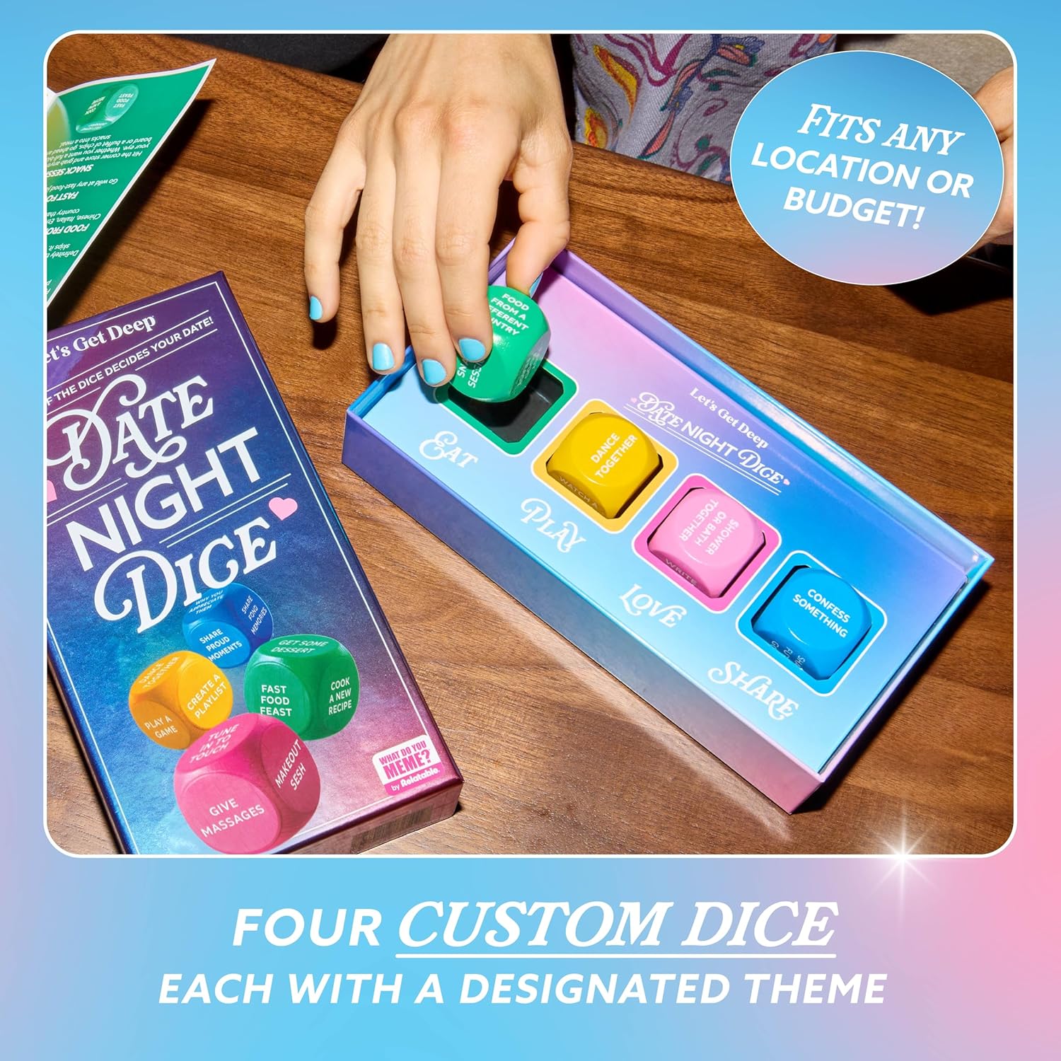 Let’s Get Deep® Date Night Dice by Relatable transforms date night planning into an exciting, spontaneous adventure for couples at any stage of their relationship. With themes like Eat, Play, Love, and Share, each roll of the dice guides partners to create fulfilling experiences that help build emotionally healthy relationships. Whether you choose to use only a few dice at a time or combine them all, Date Night Dice ensures every evening is a journey of discovery and meaningful connection. Inside you’ll find 4 custom dice, each with its own activity theme aimed at nurturing love and connection. Roll all 4 dice to create an original, well-rounded date night or just use a few to help get the ideas flowing. Our date night suggestions are designed to be accessible to everyone and work for both new and long-term couples alike. Roll the dice to find exciting couples stuff you can create together. The Eat die delivers nighttime dining inspiration, while the Play die offers suggestions for fun activities to share. The Love die helps heat things up in the romance department and the Share theme prompts deeper conversations to strengthen your bond. So whether you’re starting the dance party or playing a game, having a major makeout session, trying a new recipe, or sharing your fondest memories, you’re in for a night like no other. These fun Dice create an easy way to plan memorable dates that bring more variety and excitement to your relationship. By encouraging meaningful connections and shared experiences, Date Night Dice helps couples break out of the routine and explore new ways to bond. And if you’re looking for date night gifts for couples, Date Night Dice also makes for an excellent engagement gift, bridal shower gift, wedding gift, or anniversary gift for your favorite duo. It’s a great way to add fun and romance to your life. Surprise your loved one with this dating dice for a special occasion, like Valentine’s Day, or use it to make any date night feel like a celebration.