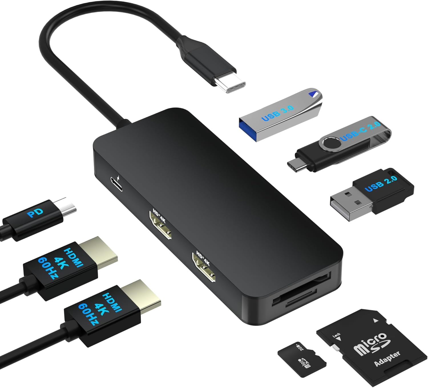 【8 IN 1 USB C Docking Station】: Laptop Docking Station converts your USB C Windows Laptops one Type C/Thunderbolt 3 port into 8 Ports: 2 x 4K@60Hz HDMI, 1 x USB 3.0, 1 x USB 2.0, 1 x USB C data, SD/TF card reader, 100W PD.